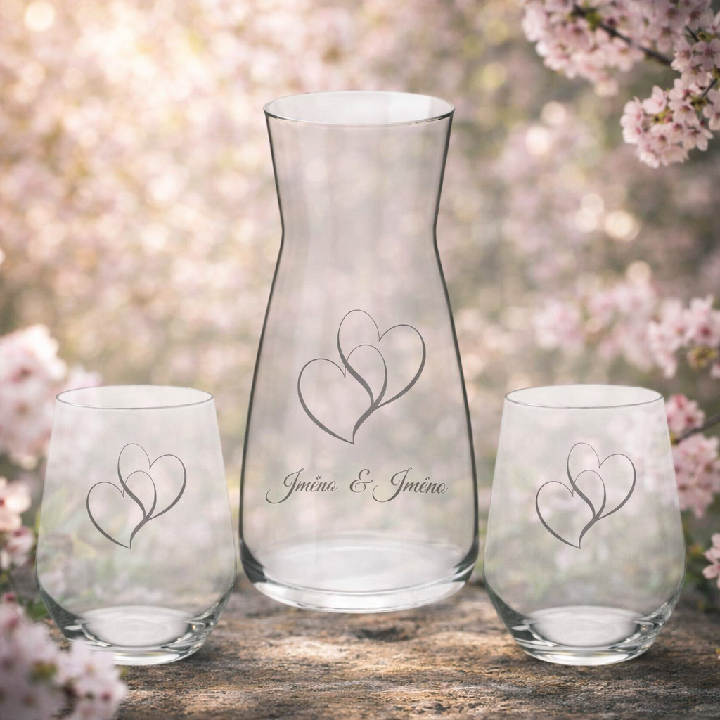 Leptaná sada karafy a sklenic – personalizovaný dárek Tato elegantní sada obsahuje 1l karafu a 2 sklenice , které můžete nechat ozdobit vlastním motivem. Ideální jako dárek k výročí, svatbě nebo jiným výjimečným příležitostem. Maximálně 3 slova na 1 ks skla = 9 Slov (např. jména, iniciály, krátký vzkaz). Vyberte si motiv – například srdce, ruce, prstýnky nebo vlastní symbol. Umístění Leptaného motivu dle přání .