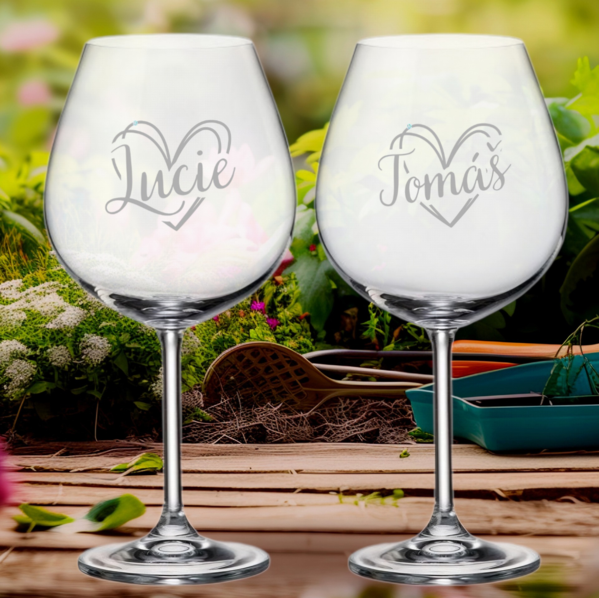 Naprostá personalizace: Na sklenice vygravírujeme jména podle vašeho přání. Každý kus je originál vyrobený přímo pro vás.